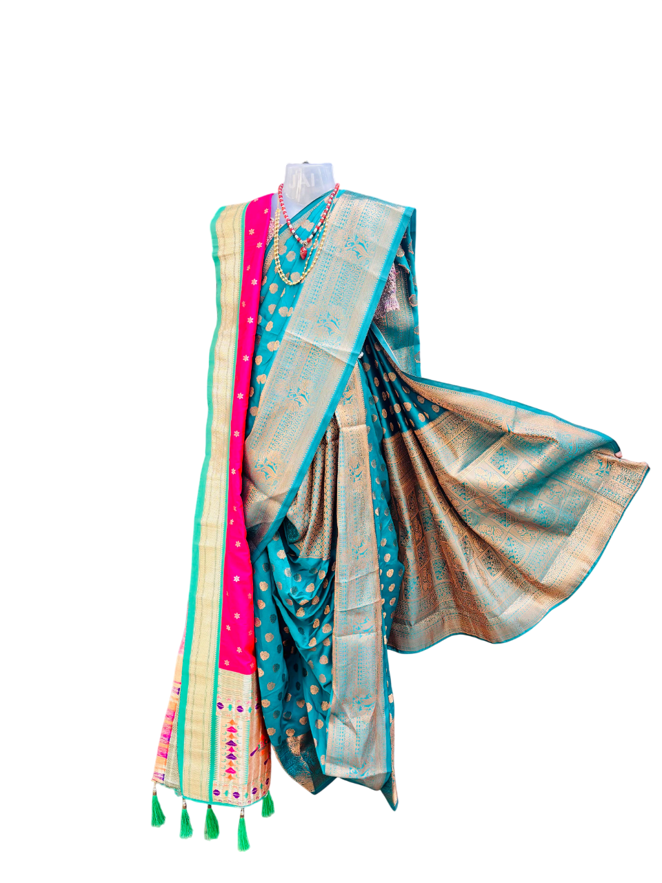If you like less pleats in the nauwari ocha then this style is for you. Also, rather than tucking just a pinch of cloth, the ocha is pleated like kashta and is then tucked in the waist. In all other aspects, it is same as Peshwai style.