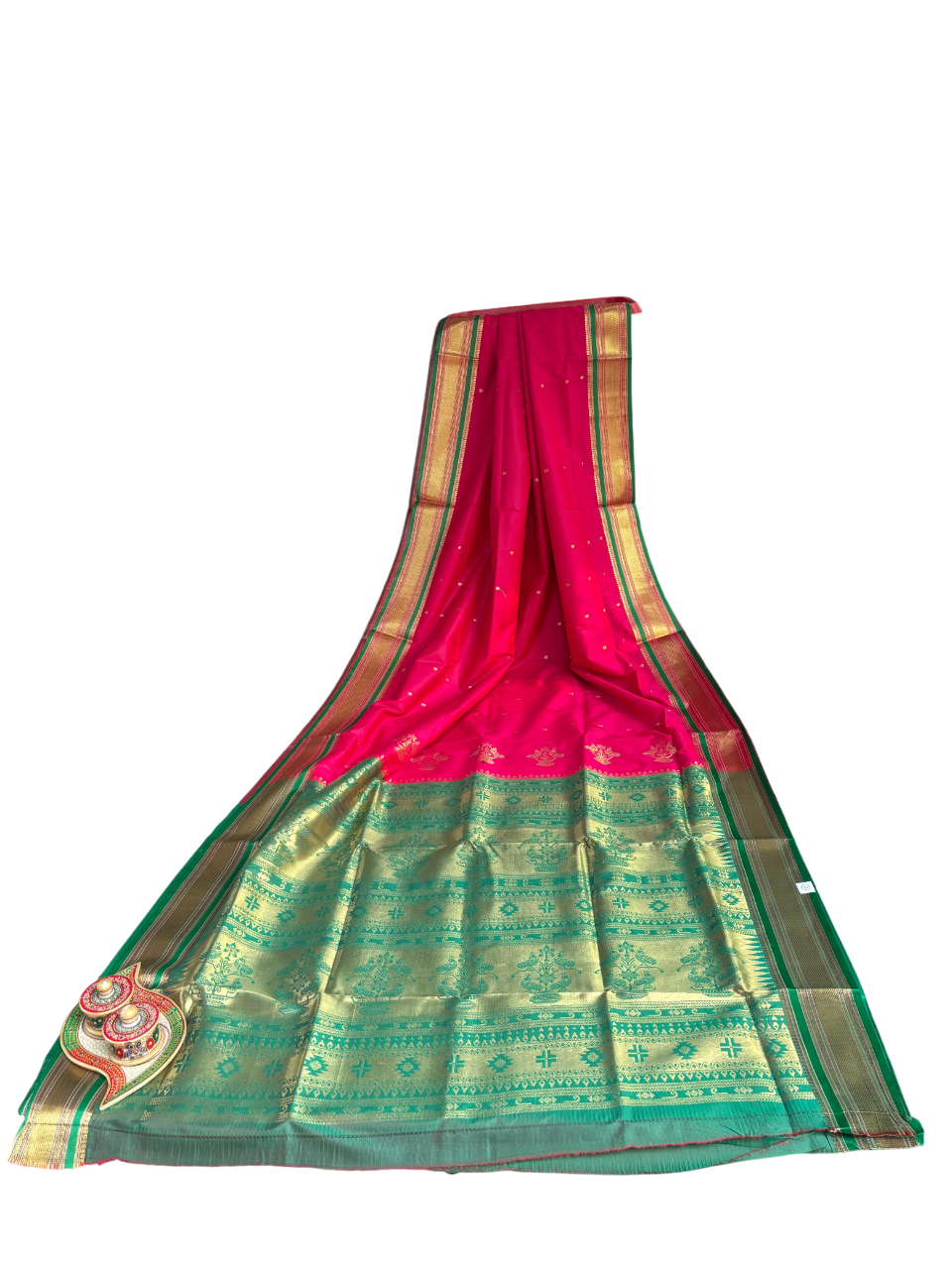 Color: Rani pink, green pallu